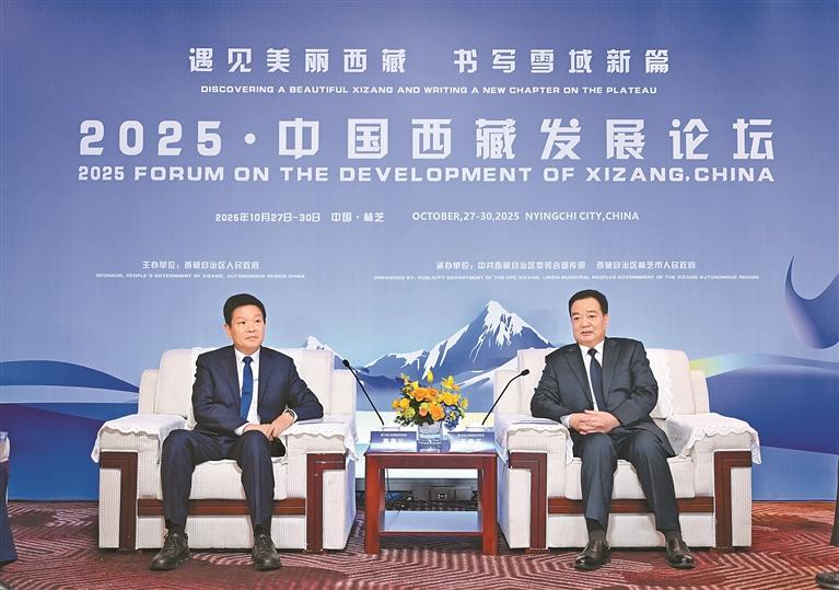 10月28日至29日,自治区党委书记王君正在林芝先后与参加2025·中国西藏发展论坛的嘉宾和国内专家学者代表座谈。这是王君正与中宣部副部长、国务院新闻办公室主任莫高义座谈。西藏日报记者 旦增西旦 摄
