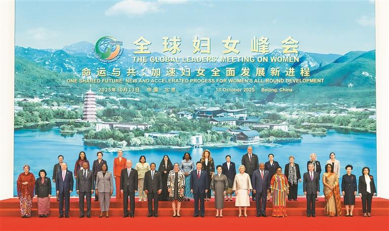 10月13日上午,国家主席习近平在北京国家会议中心出席全球妇女峰会开幕式并发表主旨讲话。这是习近平和夫人彭丽媛同与会各国和国际组织代表团团长夫妇合影留念。新华社记者 黄敬文 摄