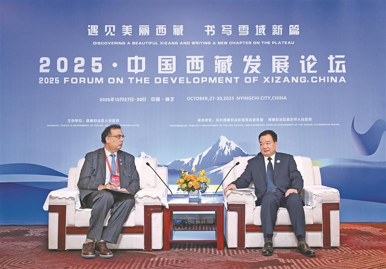 10月28日,自治区党委书记王君正在林芝会见参加2025·中国西藏发展论坛的外国政要和驻华使节。这是王君正会见联合国秘书长古特雷斯先生的代表,联合国教科文组织驻华代表、东亚办事处主任兼代表夏泽翰。西藏日报记者 旦增西旦 摄