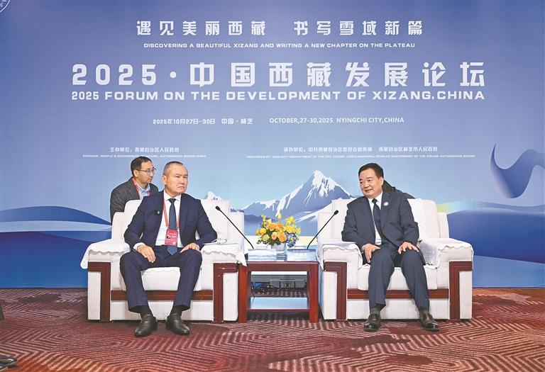 10月28日,自治区党委书记王君正在林芝会见参加2025·中国西藏发展论坛的外国政要和驻华使节。这是王君正会见吉尔吉斯共和国总统驻伊塞克湖州全权代表热季根诺夫。西藏日报记者 旦增西旦 摄
