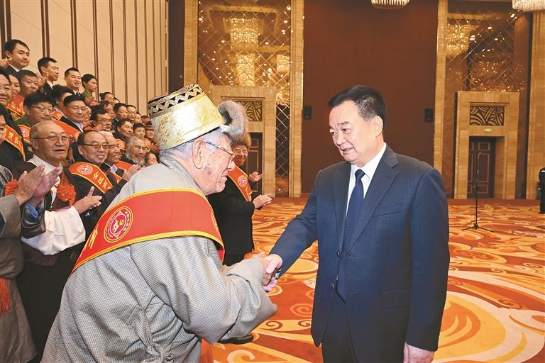 11月11日,自治区党委书记王君正在拉萨会见全区离退休干部先进集体和先进个人代表。这是王君正与受到表彰的先进集体和先进个人代表亲切握手。西藏日报记者 李洲 摄