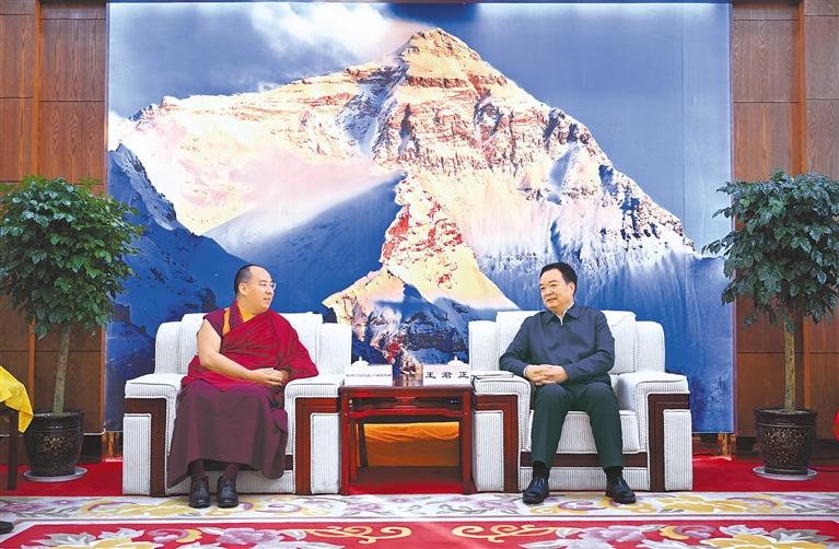 调研中,王君正会见了班禅额尔德尼·确吉杰布,对其在藏系列佛事活动和社会调研的顺利开展表示祝贺。