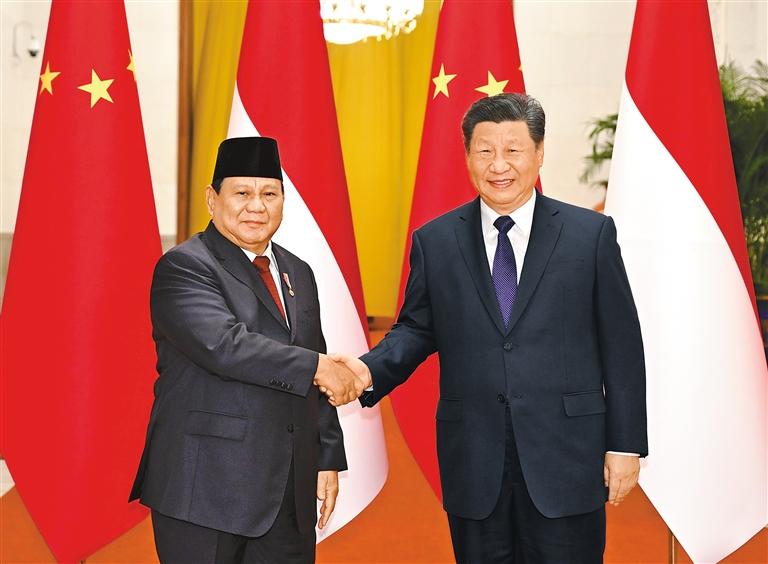 普拉博沃表示,中国是伟大的国家,印尼和中国拥有千年友好交往史,两国关系保持良好发展势头。在当前复杂国际形势下,印尼希望进一步强化同中国全方位战略协作,成为更加紧密的全面战略伙伴,构建具有地区和全球影响力的命运共同体,这将不仅造福两国人民,也为亚洲地区更好实现和平发展营造良好环境。印尼愿同中方继续高质量共建“一带一路”,完善“五大支柱”合作格局,加强基础设施、能矿、医药、农业、住房、海上共同开发、粮食安全、减贫等全方位全产业链合作,欢迎中国企业赴印尼投资。印尼完全支持中国政府在台湾问题上的立场,坚定奉行一个中国政策,坚定支持中国政府为捍卫领土完整、实现国家统一所作努力。涉疆事务完全是中国内政,印尼坚持不干涉内政原则,坚定支持中方为维护新疆发展稳定所作努力。感谢中方在巴勒斯坦问题上主持公道正义。印尼坚持独立自主,坚持不结盟外交政策,不加入任何针对第三方的军事同盟或“小圈子”,支持习近平主席提出的三大全球倡议,愿同中方密切在二十国集团等多边框架内沟通协作,为维护全球南方共同利益、促进世界多极化、推动构建人类命运共同体作出积极努力。
