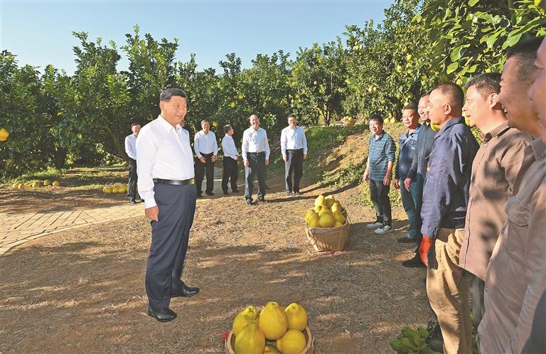 金柚是梅州的特色农产品。正值收获季节,柚子园硕果累累。习近平来到雁洋镇南福金柚种植基地,在展示厅听取广东加大对革命老区支持力度、推进乡村全面振兴等情况汇报,察看柚子及其加工产品、文创产品。他走进果林,同果农和农技人员亲切交流。得知今年金柚喜获丰收、销路畅通,习近平十分高兴。他指出,发展乡村特色产业是推进乡村全面振兴的基础,要加强科技应用,推动农文旅融合,不断延伸产业链、增加附加值,带动更多农民群众增收致富。